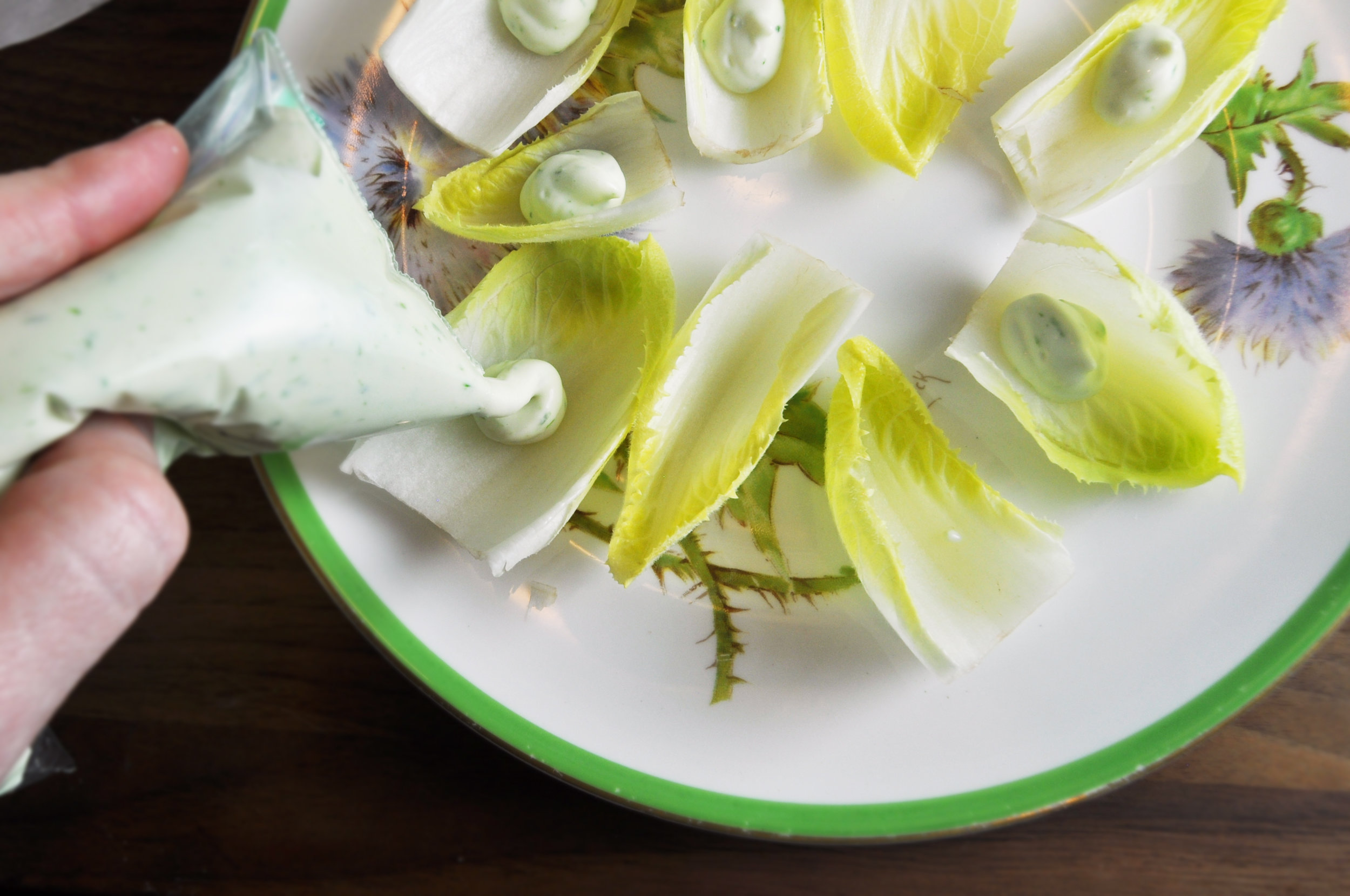 Put the mix into a zip-loc bag and cut one corner off, so you can squeeze little dollops into the endive boats.